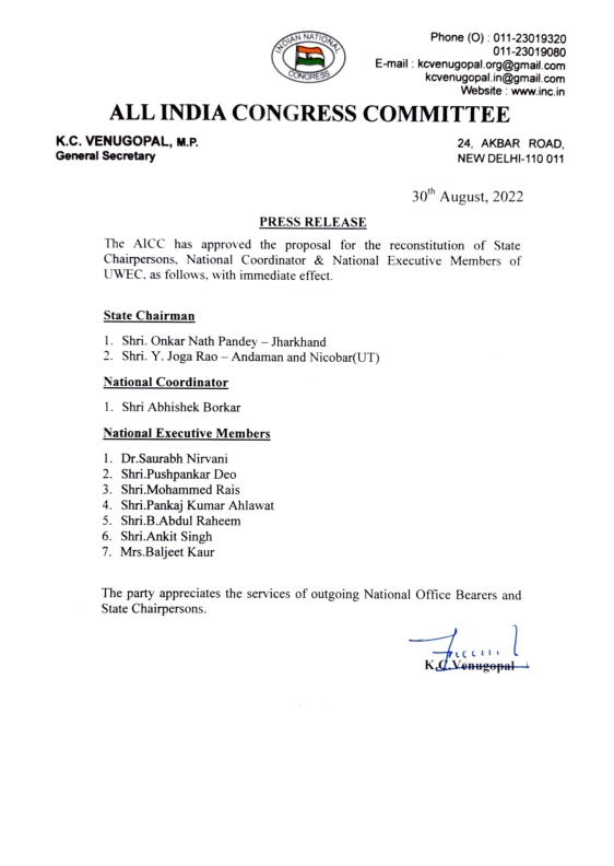 नई दिल्ली: एआईसीसी ने यूडब्ल्यूईसी के राज्य अध्यक्षों, राष्ट्रीय समन्वयक और राष्ट्रीय कार्यकारिणी सदस्यों के पुनर्गठन के प्रस्ताव को तत्काल प्रभाव से मंजूरी दे दी है। ये जानकारी कांग्रेस सांसद एंव महासचिव के सी वेणुगोपाल ने प्रेस रिलीज के माध्यम से दी हैं -लिस्ट पढ़े।