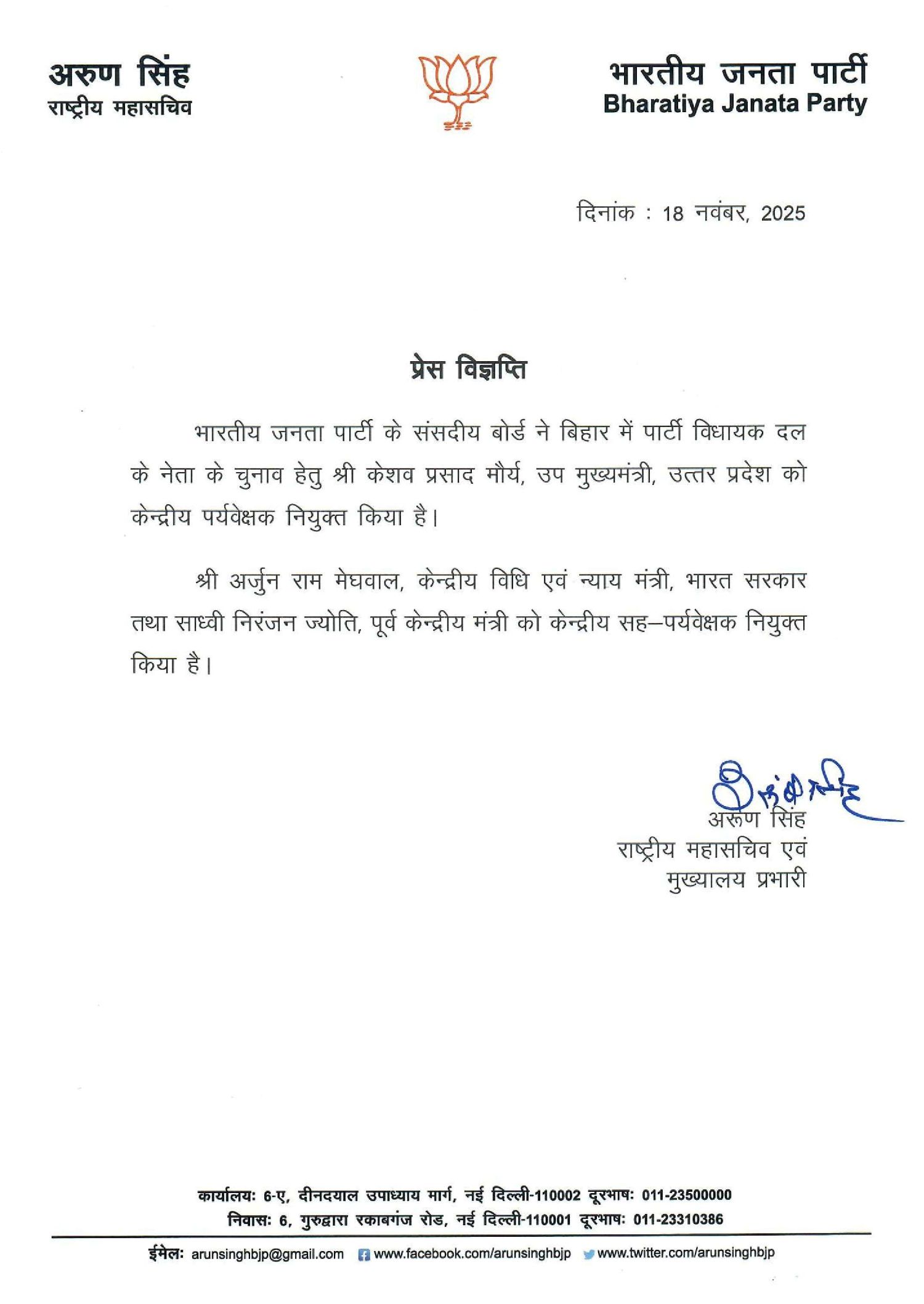 नई दिल्ली: भारतीय जनता पार्टी के संसदीय बोर्ड ने आज मंगलवार को बिहार पार्टी विधायक दल के नेता चुन ने के लिए उत्तर प्रदेश के उप -मुख्यमंत्री केशव प्रसाद मौर्य को केंद्रीय पर्यवेक्षक नियुक्त किया है। और अर्जुन राम मेघवाल , केंद्रीय विधि एवं न्याय मंत्री , भारत सरकार व साध्वी निरंजन ज्योति , पूर्व केंद्रीय मंत्री को केंद्रीय सह -पर्यवेक्षक नियुक्त किया गया है।