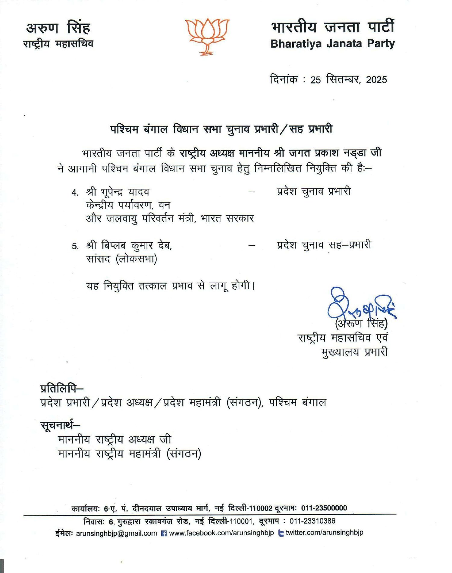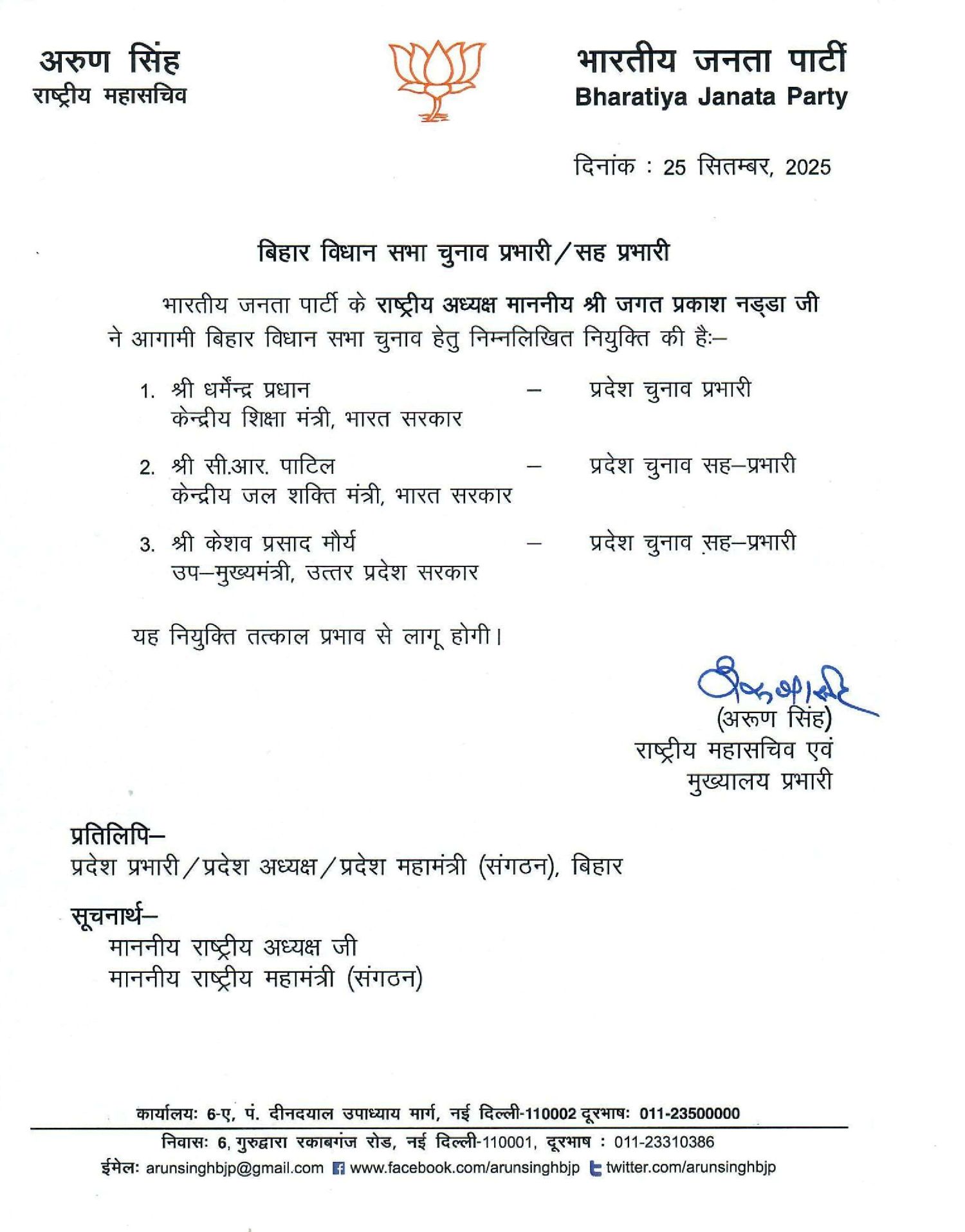नई दिल्ली: भारतीय जनता पार्टी के अध्यक्ष जे पी नड्डा ने आज गुरुवार को बिहार व पश्चिम बंगाल में होने वाले विधानसभा चुनावों के लिए प्रदेश प्रभारियों एवं प्रदेश सह -प्रभारियों की तुरंत प्रभाव से नियुक्ति की है। बिहार में केंद्रीय शिक्षा मंत्री भारत सरकार धर्मेंद्र प्रधान को प्रदेश प्रभारी व केंद्रीय जल शक्ति मंत्री , भारत सरकार सीआर पाटिल व उत्तर प्रदेश के उप -मुख्यमंत्री केशव प्रसाद मौर्य को प्रदेश सह -प्रभारी नियुक्त किया गया है। इसके अलावा पश्चिम बंगाल में भी होने वाले विधानसभा चुनाव के लिए केंद्रीय पर्यावरण वन, और जलवायु परिवर्तन मंत्री भारत सरकार भूपेंद्र यादव को प्रभारी व सांसद बिप्लब देव को सह -प्रभारी नियुक्त किया गया है।