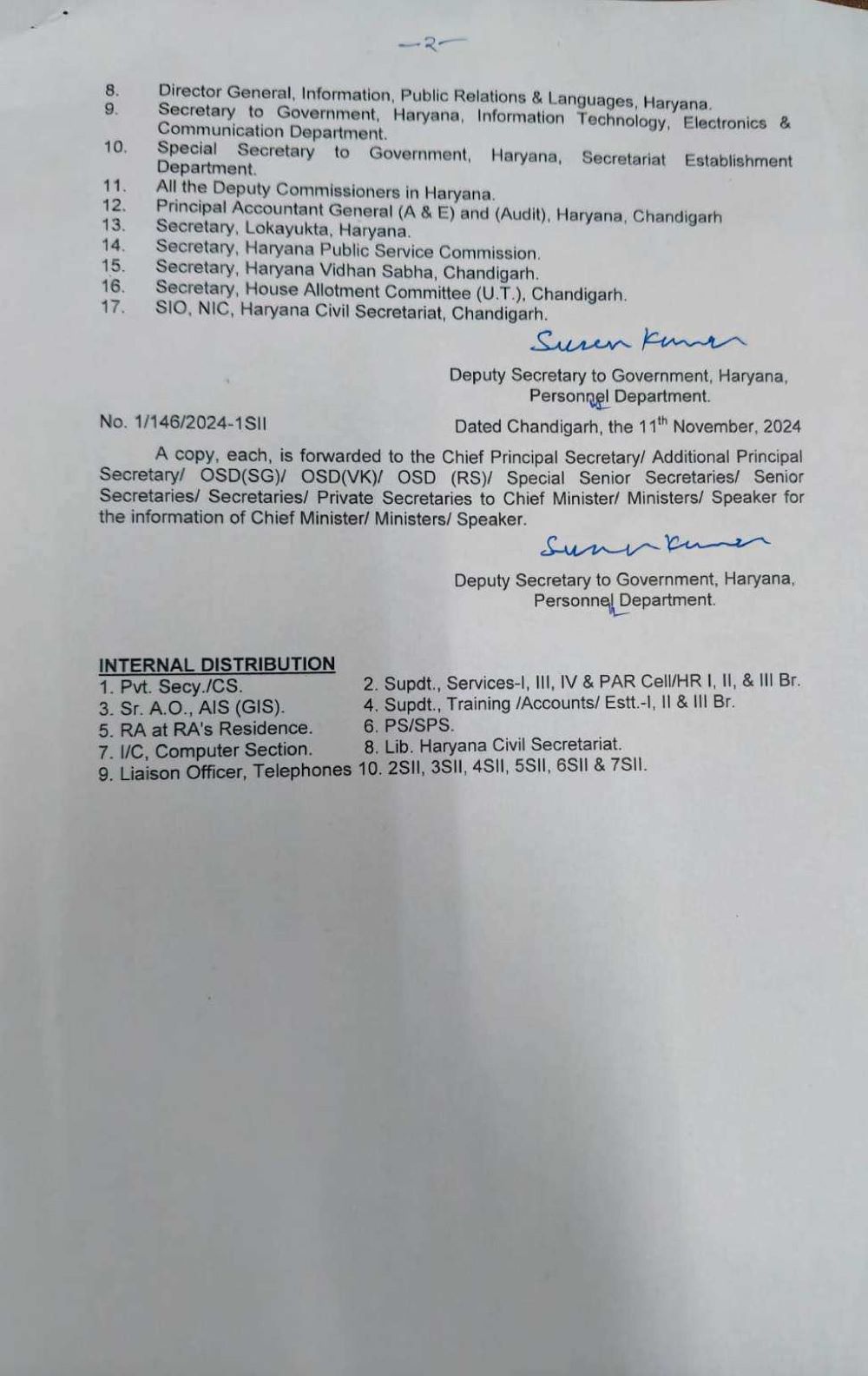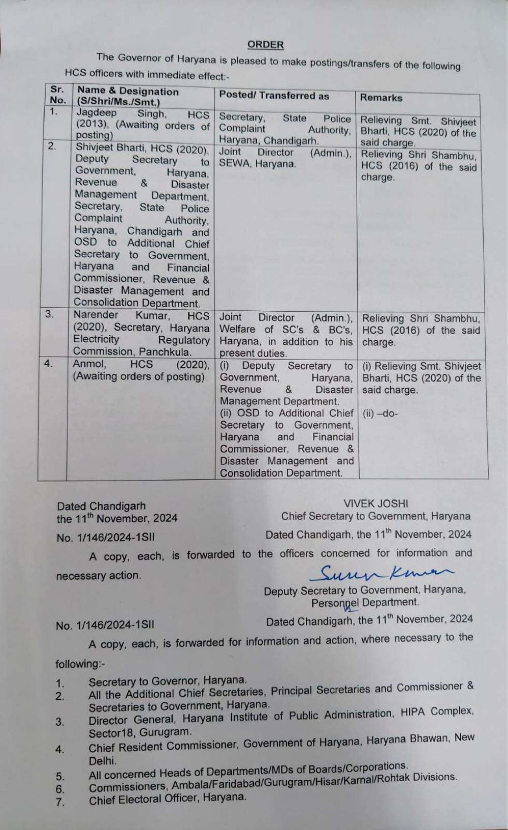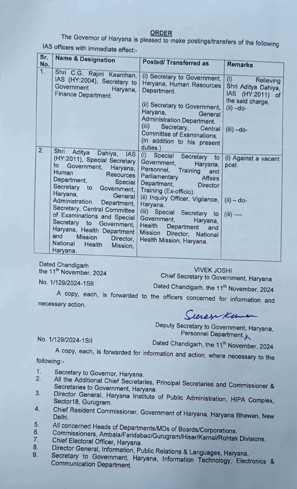 चंडीगढ़: हरियाणा सरकार ने आज सोमवार को तुरंत प्रभाव से दो आईएएस और चार एचसीएस अधिकारीयों के तबादले एंव नियुक्ति आदेश जारी किए है। सरकार द्वारा जारी किए गए लिस्ट को इस खबर में प्रकाशित की गई है ,को आप पढ़ सकते है और इन सभी अधिकारीयों के नाम जान सकते है।