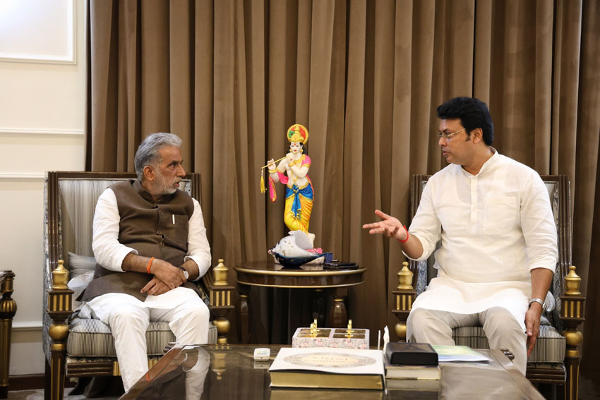 चंडीगढ़:केंद्रीय मंत्री कृष्णपाल गुर्जर मंगलवार को हरियाणा विधानसभा चुनाव सह प्रभारी, सांसद एवं त्रिपुरा के पूर्व मुख्यमंत्री बिप्लब कुमार देब से मिलने उनके दिल्ली आवास पर पहुंचे। बिप्लब देब ने गुर्जर का अपने आवास पर पहुंचने पर गर्मजोशी से स्वागत किया। इस दौरान दोनों नेताओं के बीच हरियाणा विधानसभा चुनाव और संगठनात्मक विषय को लेकर घंटे भर बातचीत हुई। राज्य के राजनीतिक हालातों के साथ-साथ केंद्र सरकार की ओर से चलाई जा रही जनकल्याणकारी योजनाओं की प्रगति के बारे में भी चर्चा हुई। दोनों नेताओं ने हरियाणा में तीसरी बार फिर से पूर्ण बहुमत की सरकार बनने का दावा किया है।