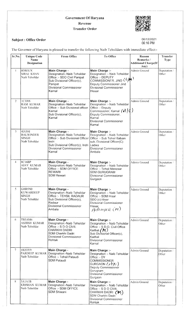 चंडीगढ़ : हरियाणा सरकार ने आज तुरंत प्रभाव से 42 नायब तहसीलदारो के तबादले.किए हैं। आप इस खबर में प्रकाशित तबादले लिस्ट को पढ़ कर जानते हैं उनके नाम। ये तबादले की लिस्ट कुल छह पेज में हैं।