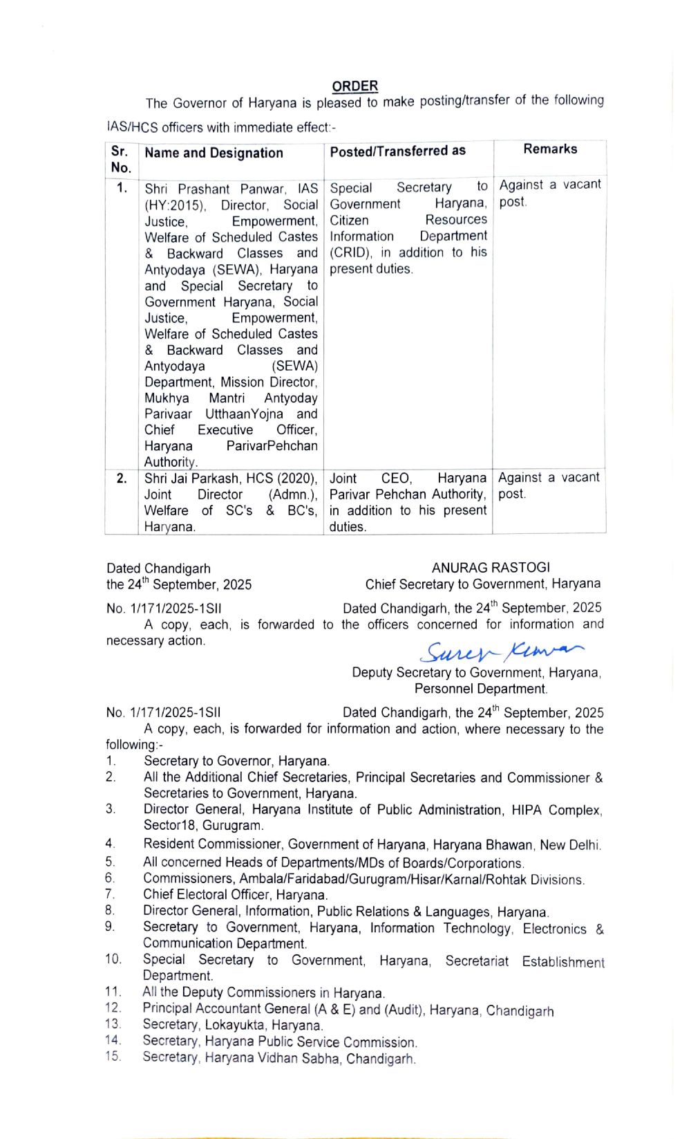 चंडीगढ़:हरियाणा सरकार ने आज बुधवार को तुरंत प्रभाव से एक आईएएस और एक एचसीएस अधिकारियों के तबादले एवं नियुक्ति आदेश जारी किए है। तबादले की लिस्ट इस खबर में प्रमुखता प्रकाशित की गई है, जिनमें आप उपरोक्त दोनों अधिकारियों के नाम आप खुद पढ़ सकते है।