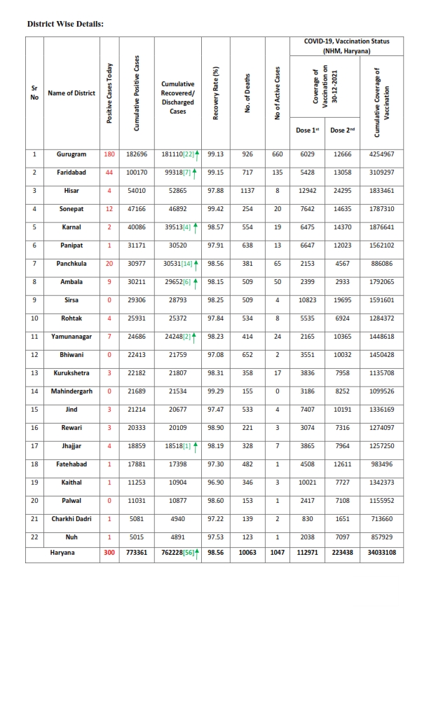 चंडीगढ़: हरियाणा प्रदेश में आज कोरोना मरीजों में आई उछाल , 300 नए केस, गुरुग्राम, फरीदाबाद व पंचकूला में ज्यादा केस