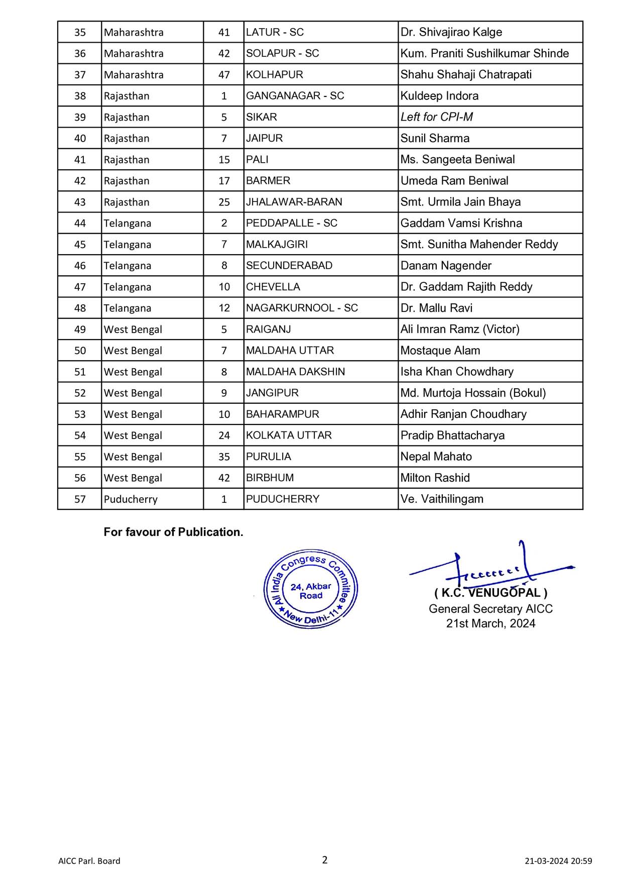 नई दिल्ली: कांग्रेस पार्टी ने वीरवार की देर शाम को होने वाले लोकसभा 2024 चुनाव के लिए आठ प्रदेशों में कुल 57 उम्मीदवारों के नाम की लिस्ट जारी की हैं। इसमें अरुणाचल -2 , गुजरात -11, कर्नाटक -17, महाराष्ट्र -7 , राजस्थान -6 , तेलंगाना-5 , वेस्ट बंगाल -8 व पुडुचेरी-1 के उम्मीदवारों के नाम शामिल हैं। आप पार्टी द्वारा जारी की गई लिस्ट को इस खबर में पढ़ सकतें हैं , और जान सकते हैं आप सभी उम्मीदवारों के नाम।