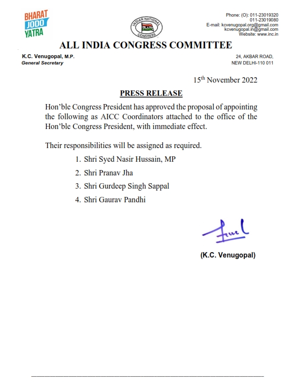 नई दिल्ली:कांग्रेस अध्यक्ष मल्लिकार्जुन खड़गे ने आज तत्काल प्रभाव से कांग्रेस अध्यक्ष के कार्यालय से जुड़े समन्वय के रूप में निम्नलिखित को नियुक्त करने के प्रस्ताव को मंजूरी दे दी है, पार्टी द्वारा जारी किए गए लिस्ट को इस खबर में पढ़े।