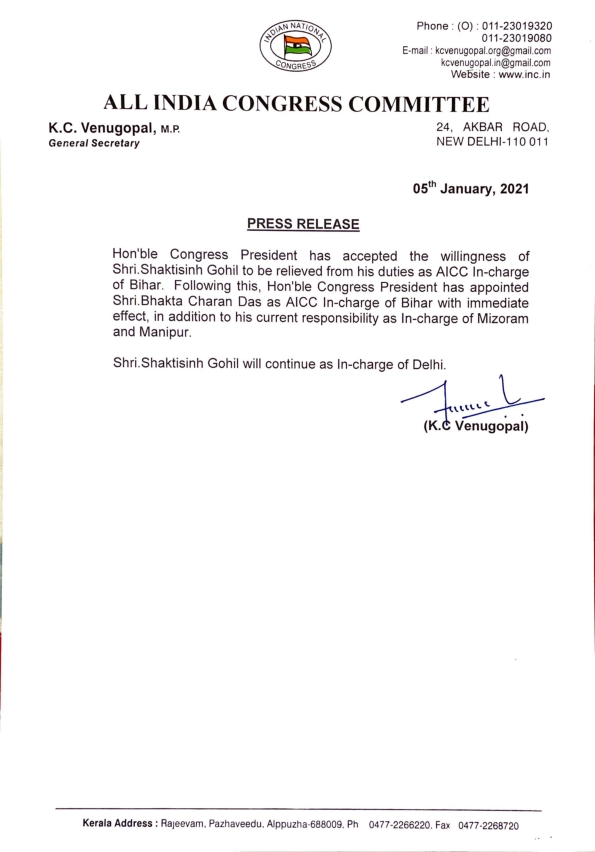 नई दिल्ली: कांग्रेस अध्यक्ष सोनिया गांधी ने बिहार के प्रभारी के रूप में अपने कर्तव्यों से मुक्त होने के लिए शक्ति सिंह गोहिल की इच्छा को स्वीकार कर लिया है। इसके बाद, अभिनंदन अध्यक्ष ने अपनी वर्तमान जिम्मेदारी के अलावा, भक्त चरण दास को तत्काल प्रभाव से बिहार के प्रभारी के रूप में नियुक्त किया है। मिजोरम और मणिपुर के प्रभारी के रूप में ,शक्ति सिंह गोहिल प्रभारी के रूप में जारी रहेंगे.