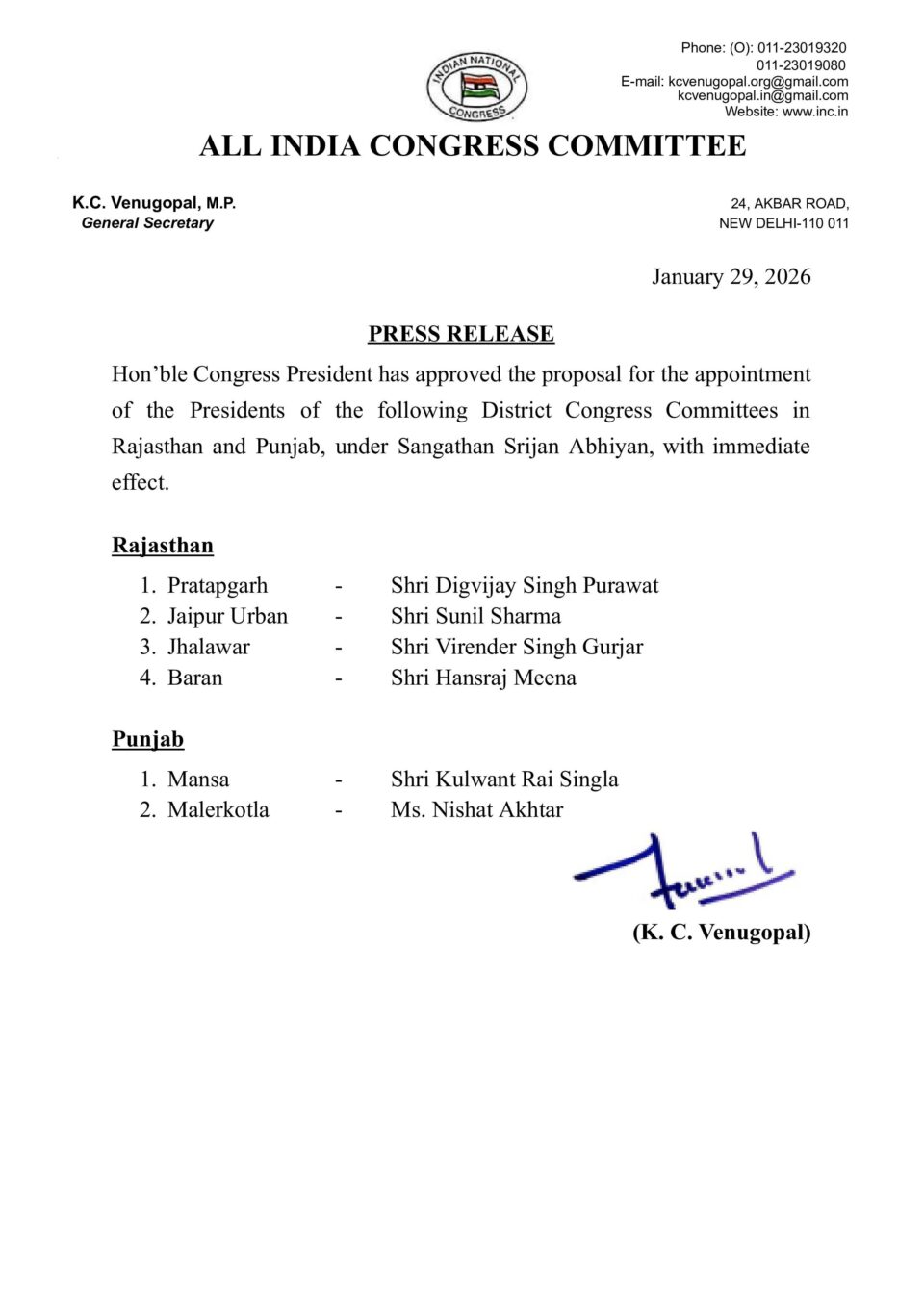 नई दिल्ली:कांग्रेस अध्यक्ष मल्लिकार्जुन खरगे ने आज गुरुवार को नियुक्ति के प्रस्ताव को मंजूरी दे दी है निम्नलिखित जिला कांग्रेस समितियों के अध्यक्षों में से संगठन सृजन अभियान के तहत राजस्थान और पंजाब, तत्काल, पार्टी द्वारा जारी की गई लिस्ट को इस खबर में प्रमुखता से प्रकाशित की गई है, जिनमें आप नव -नियुक्त अध्यक्षों के नाम को पढ़ सकते है।