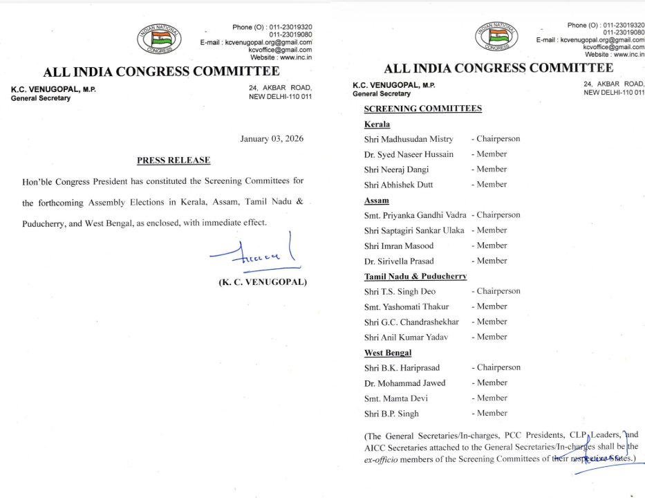नई दिल्ली:कांग्रेस अध्यक्ष मल्लिकार्जुन खरगे ने आज शनिवार को तत्काल प्रभाव से केरल, असम, तमिलनाडु, पुडुचेरी और पश्चिम बंगाल में आगामी विधानसभा चुनावों के लिए स्क्रीनिंग कमेटी का गठन किया है। पार्टी द्वारा जारी की लिस्ट को इस खबर में पढ़े।