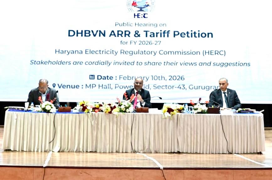 एचईआरसी अध्यक्ष नन्द लाल शर्मा, आयोग के सदस्य मुकेश गर्ग एवं सदस्य  शिव कुमार मंगलवार को दक्षिण हरियाणा बिजली वितरण निगम (डीएचबीवीएन ) द्वारा नए वित्त वर्ष 2026–27 के लिए दायर की गई वार्षिक राजस्व आवश्यकता (एआरआर) याचिका पर बिजली उपभोक्ताओं के सुझाव,टिप्पणियाँ एवं आपत्तियां दर्ज करने हेतु गुरुग्राम में आयोजित जनसुनवाई की अध्यक्षता कर रहे थे। जनसुनवाई में आयोग के वरिष्ठ अधिकारी भी उपस्थित रहे। इस अवसर पर डीएचबीवी एन के प्रबंध निदेशक विक्रम सिंह सहित गुरुग्राम, मानेसर, सोहना एवं अन्य औद्योगिक क्षेत्रों के विभिन्न औद्योगिक संगठनों के प्रतिनिधियों ने भाग लिया।