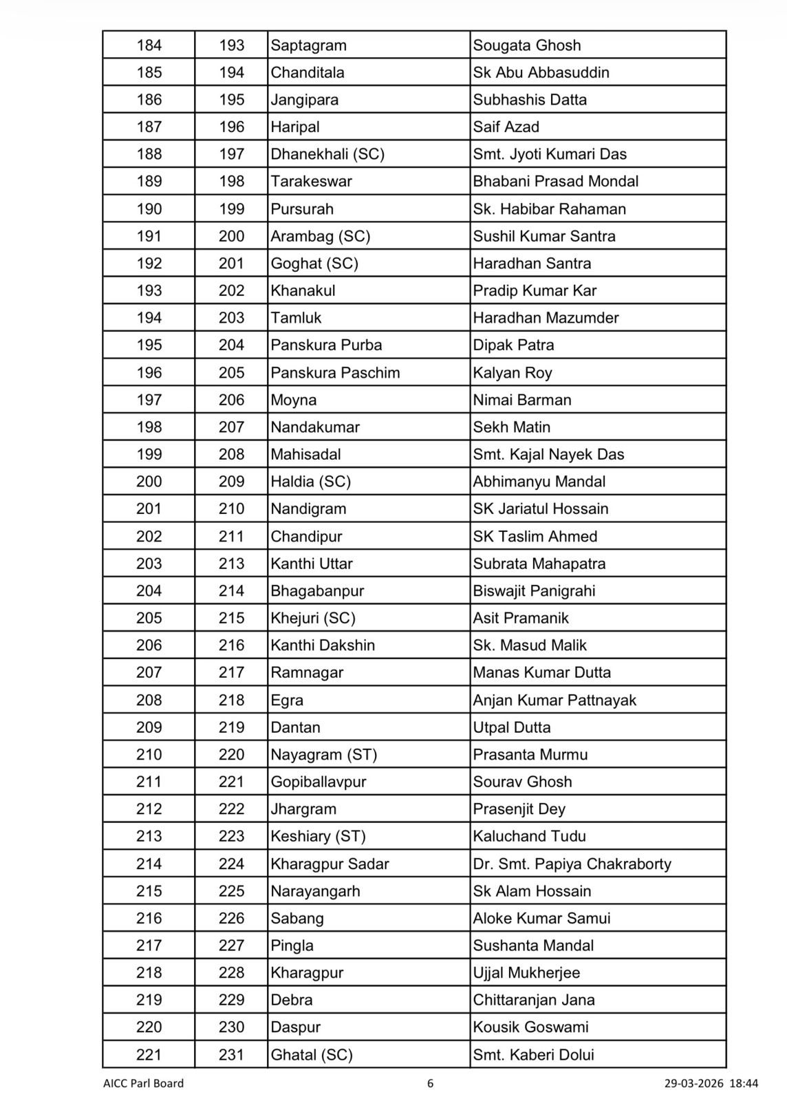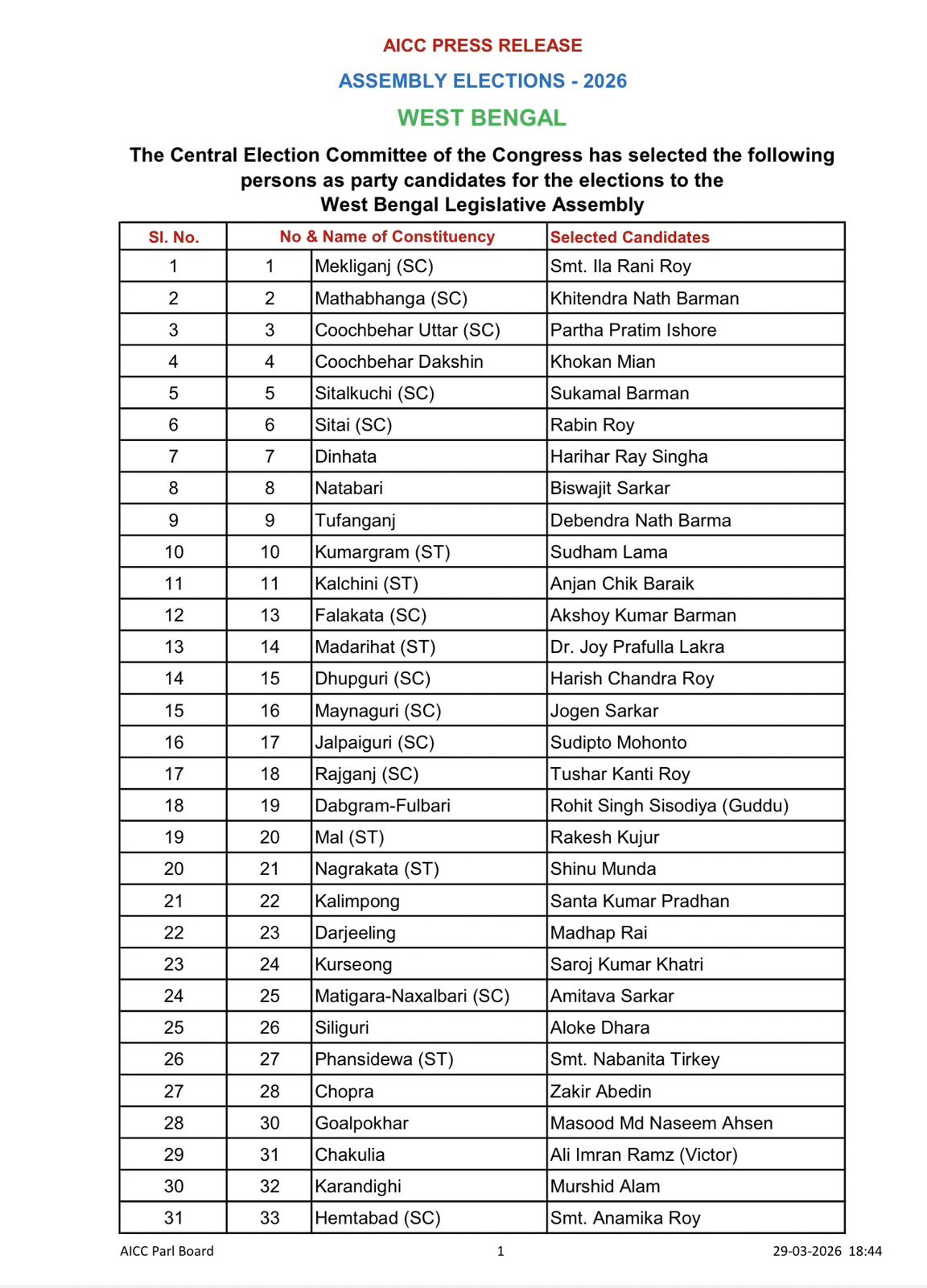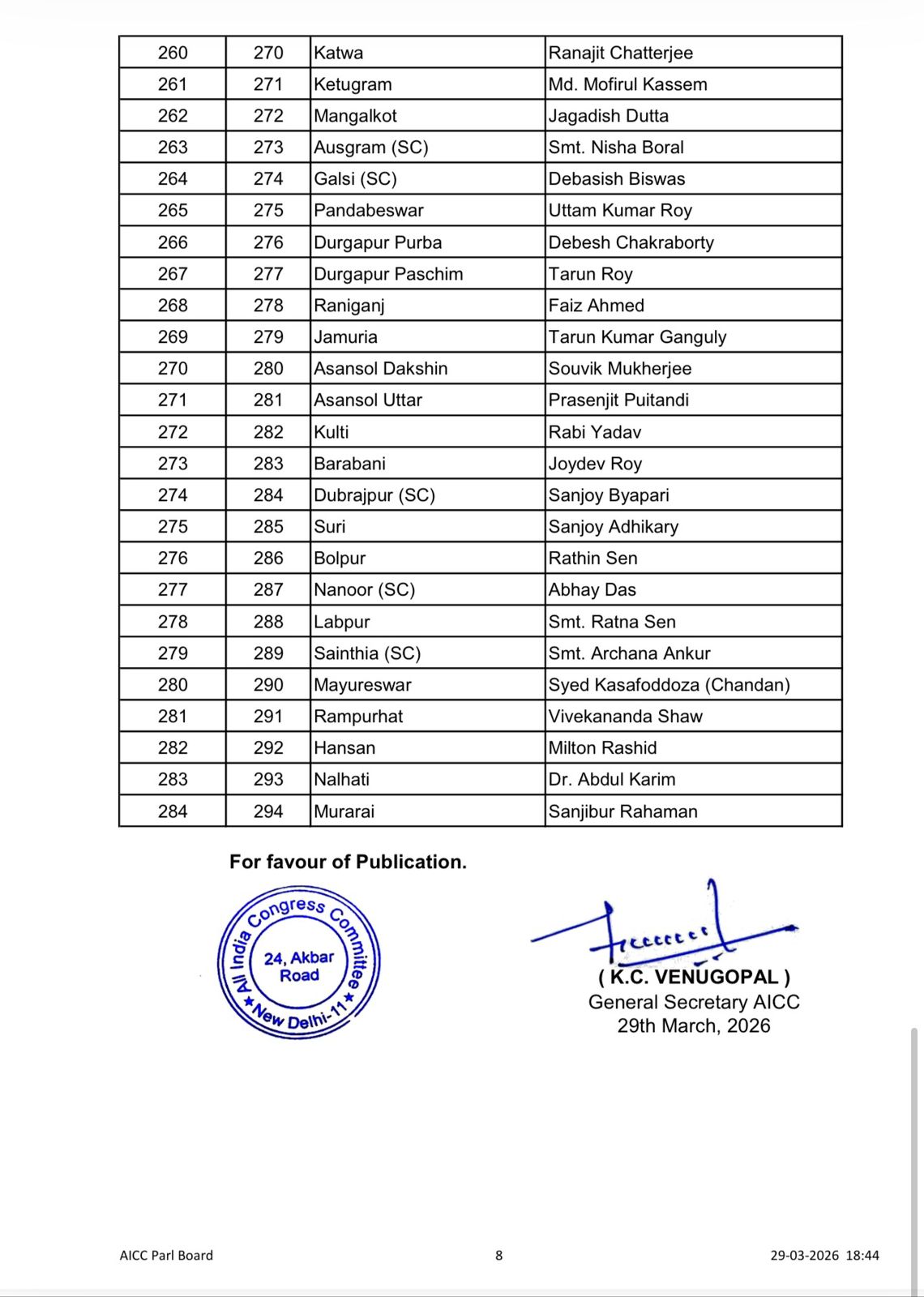 नई दिल्ली: कांग्रेस पार्टी ने आज रविवार, शाम को पश्चिम बंगाल में होने वाले विधानसभा चुनाव -2026 के लिए 284 उम्मीदवारों के नाम की लिस्ट जारी किए है , यह लिस्ट कुल 8 पेजों में है। पार्टी द्वारा जारी किए गए लिस्ट को इस खबर में प्रमुखता से प्रकाशित की गई है जिसमें आप खुद विधानसभा क्षेत्र के अनुसार सभी उम्मीदवारों के नाम पढ़ सकते है।