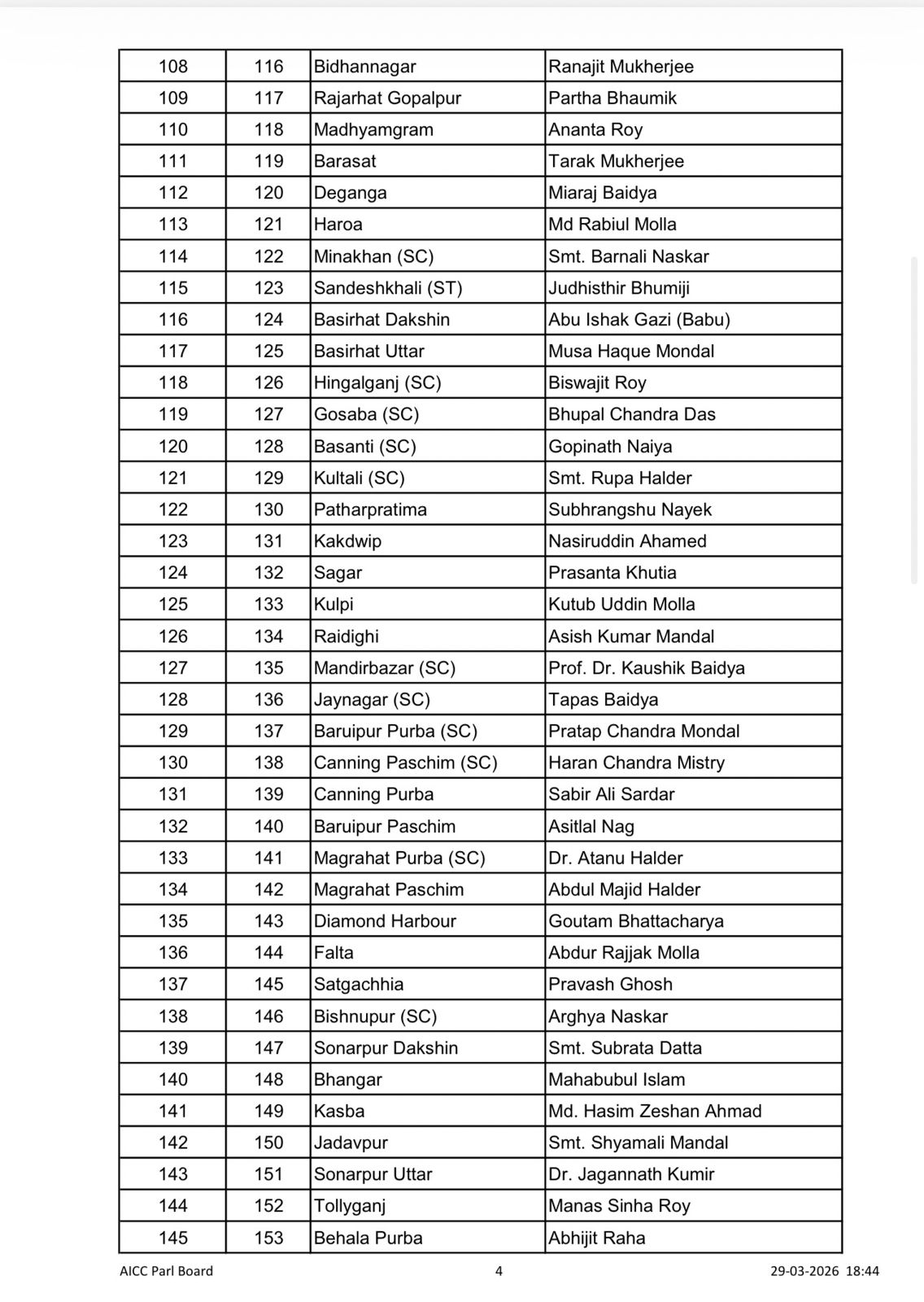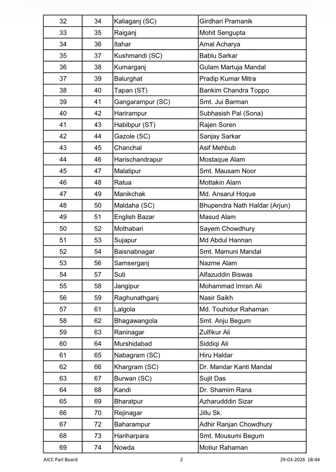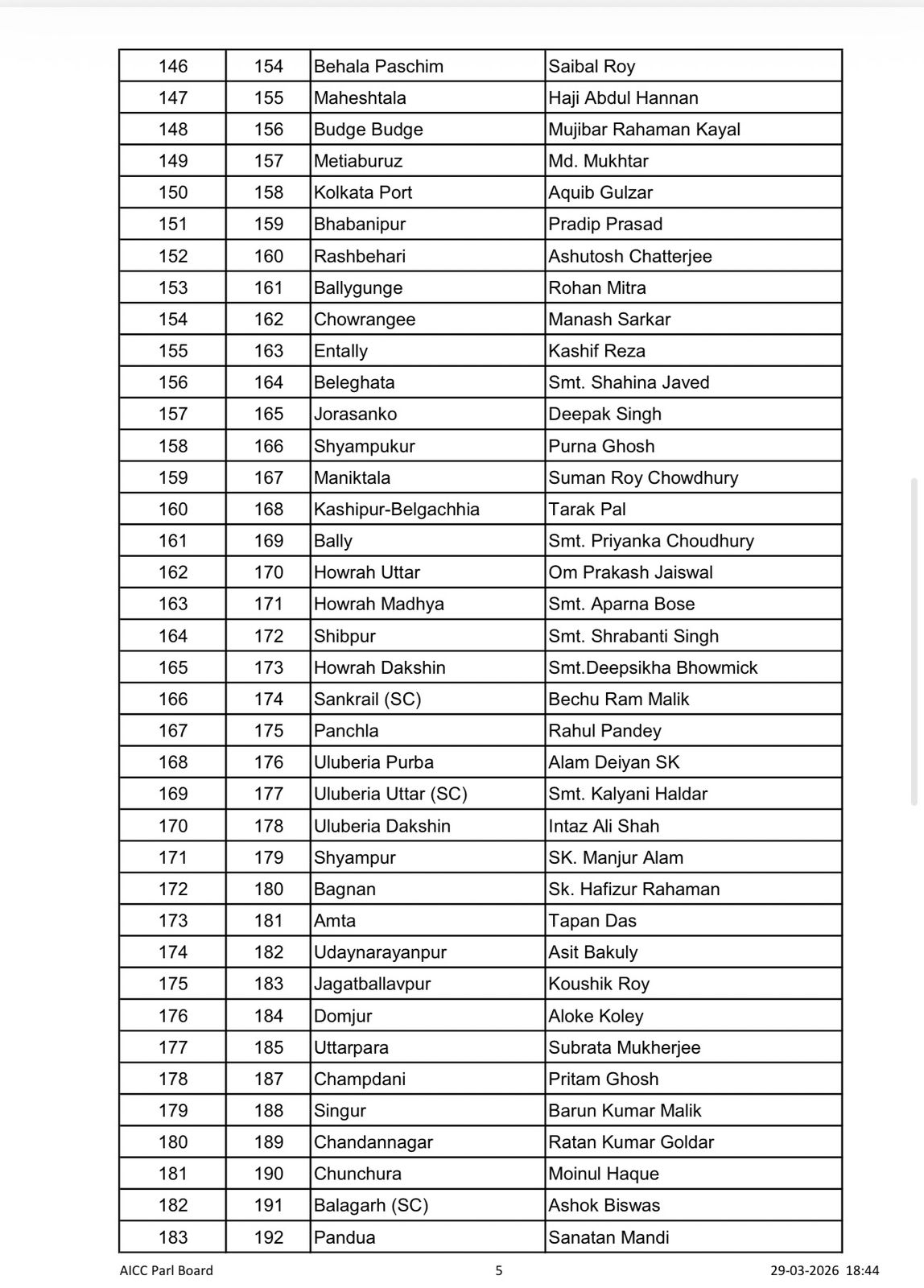नई दिल्ली: कांग्रेस पार्टी ने आज रविवार, शाम को पश्चिम बंगाल में होने वाले विधानसभा चुनाव -2026 के लिए 284 उम्मीदवारों के नाम की लिस्ट जारी किए है , यह लिस्ट कुल 8 पेजों में है। पार्टी द्वारा जारी किए गए लिस्ट को इस खबर में प्रमुखता से प्रकाशित की गई है जिसमें आप खुद विधानसभा क्षेत्र के अनुसार सभी उम्मीदवारों के नाम पढ़ सकते है।
