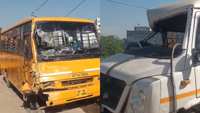 ग्रेटर नोएडा के दादरी बाईपास पर आज सुबह उस वक्त चीख-पुकार मच गई, जब दो निजी स्कूलों की बसें आपस में टकरा गईं। यह दर्दनाक हादसा जीजस मैरी स्कूल और रामाज्ञा पब्लिक स्कूल की बसों के बीच हुआ। हादसे में जीजस मैरी स्कूल की बस में सवार एक दर्जन से अधिक बच्चे घायल हो गए हैं।प्रत्यक्षदर्शियों और बच्चों के परिजनों के अनुसार, हादसा बेहद भीषण था। घायल बच्चों के दादा, जे पी मित्तल ने बताया कि उनके दो पोते भी इस बस में सवार थे। उन्होंने कहा, जीजस मैरी स्कूल की बस बच्चों को उतारने के लिए साइड में जा रही थी, तभी सामने से आ रही दूसरी स्कूल बस (रामाज्ञा पब्लिक स्कूल) ने बेहद तेज रफ्तार में टक्कर मार दी। टक्कर इतनी जोरदार थी कि बस के परखच्चे उड़ गए।
