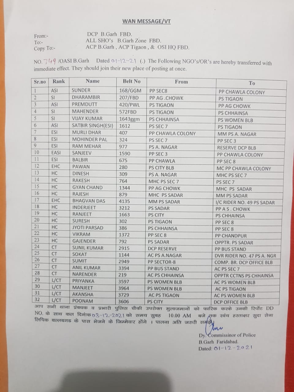 फरीदाबाद: बल्लभगढ़ डीसीपी जयवीर राठी ने आज तुरंत प्रभाव से 32 पुलिस कर्मियों को इधर से उधर किए हैं, इस तबादले लिस्ट में सब इंस्पेक्टर , असिस्टेंट सब इंस्पेक्टर , हेड कवाटर व कॉस्टेबल स्तर के पुलिस कर्मी शामिल हैं। इस खबर में प्रकाशित तबादले लिस्ट को स्वंय पढ़ कर उनके नाम को जान सकते हैं।