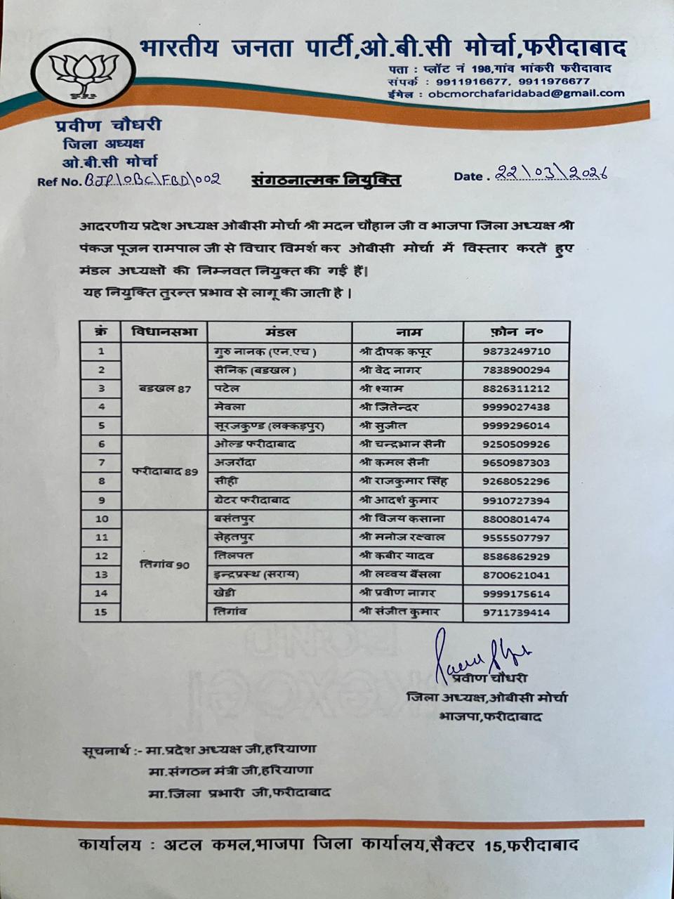 जिलाध्यक्ष प्रवीण चौधरी ने बताया कि बडख़ल विधानसभा के अन्तर्गत गुरू नानक (एन.एच.)मंडल का दीपक कपूर को अध्यक्ष, सैनिक (बडख़ल) वेद नागर को, पटेल मंडल श्याम को, मेवला मंडल का जितेन्द्र को, सूरजकुण्ड (लकड़पुर) मंडल का सुजीत को अध्यक्ष नियुक्त किया है।इसके अलावा फरीदाबाद विधानसभा क्षेत्र के अन्तर्गत आने वाले ओल्ड फरीदाबाद मंडल का चन्द्रभान, अजरोंदा मंडल से कमल सैनी, सीही से राजकुमार सिंह, ग्रेटर फरीदाबाद से आदर्श कुमार को मंडल अध्यक्ष नियुक्त किया गया।