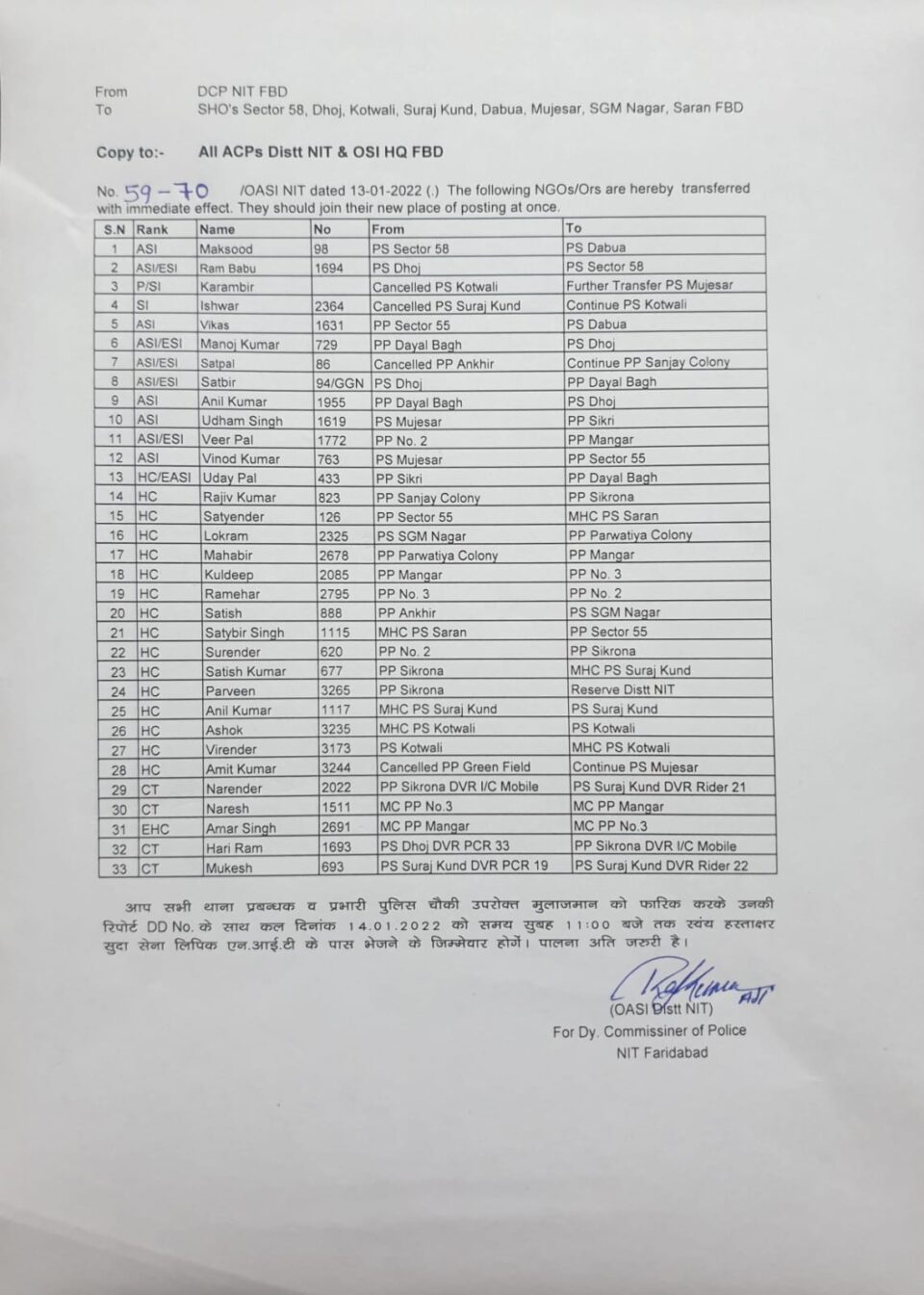 फरीदाबाद: एनआईटी डीसीपी नितिन अग्रवाल ने आज तुरंत प्रभाव से 33 पुलिस कर्मियों को इधर से उधर किए हैं। इस तबादले लिस्ट में उप -निरीक्षक, सहायक उप -निरीक्षक, हवलदार व सिपाही स्तर के कर्मी शामिल हैं। जिनके तबादले हुए हैं आप उनके नाम इस खबर में प्रकाशित तबादले लिस्ट में पढ़ सकतें हैं।