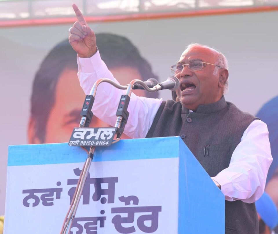 कांग्रेस अध्यक्ष ने कहा कि मोदी सरकार द्वारा आज एक तय तरीके से किसानों को खत्म करने की साजिश रची जा रही है। देश की खेती को चंद पूंजीपतियों के हवाले करने की योजना तैयार थी, लेकिन किसानों के आंदोलन ने किसानी को बचा लिया।  खरगे ने कहा कि मोदी सरकार ने पिछले 10 वर्षों में किसानों और जवानों पर भारी चोट की है। किसान और जवान देश की रीढ़ की हड्डी थे, उनको तोड़ने का काम मोदी सरकार ने किया। प्रधानमंत्री नरेंद्र मोदी ने किसानों से कई वादे किए थे, मगर कोई वादा पूरा नहीं किया। मोदी जी ने किसानों को आंदोलनजीवी कहा। किसान तीन काले कानूनों के खिलाफ दिल्ली के बॉर्डर पर बैठे रहे, लेकिन उनसे बात तक नहीं की। मोदी सरकार की किसान विरोधी नीतियों को उजागर करते हुए खरगे ने कहा कि आजादी के बाद पहली बार हर किसान पर 25 हजार रुपये प्रति हेक्टेयर टैक्स लगाया गया। प्रधानमंत्री फसल बीमा योजना को प्राइवेट बीमा कंपनी की मुनाफा योजना बना दिया गया। वर्ष 2016 से 2022 के बीच बीमा कंपनियों ने 40 हजार करोड़ रुपये कमाए। कांग्रेस अध्यक्ष ने कहा कि मोदी सरकार ने एक तरफ किसानों को बर्बाद किया तो दूसरी तरफ अग्निवीर योजना लाकर जवानों को भी नहीं छोड़ा। रक्षा के क्षेत्र में 30 प्रतिशत भर्तियां खाली हैं, लेकिन फिर भी मोदी सरकार ने नियमित भर्तियां बंद कर दी हैं। देश में 30 लाख सरकारी पद ख़ाली पड़े हैं। इसमें से 15 लाख पद दलित, आदिवासी, अन्य पिछड़े वर्ग के लोगों को मिल जाते, इसलिए मोदी सरकार भर्ती नहीं कर रही है। खरगे ने कहा कि अंग्रेजों के जमाने में आरएसएस-भाजपा के लोगों ने अंग्रेजों की मदद की थी। आज ये लोग रोज़ उठकर कांग्रेस और राहुल गांधी को गालियां देते हैं। जो व्यक्ति पदयात्रा निकालता है, उसको भला बुरा कहते हैं।  कांग्रेस अध्यक्ष ने कहा कि कांग्रेस ऐसा राज चाहती है, जहां संविधान का शासन हो, लोकतंत्र हो। मोदी जी सिर्फ़ अमीरों के लिए काम करते हैं। मालदारों के लिए काम करते हैं। इसलिए गरीब और गरीब, अमीर और अमीर बन रहा है।  खरगे ने कहा कि कांग्रेस सरकारों ने बांध बनाए, श्वेत, हरित क्रांति लाई और पंजाब कृषि विश्वविद्यालय जैसे संस्थान स्थापित किए। उन्होंने भाजपा और मोदी को चुनौती दी कि वे एक भी ऐसा काम बताएं जो उन्होंने देश के लिए किया हो। खरगे ने कहा कि आज बड़े-बड़े उद्योगों को प्रधानमंत्री मोदी के एक ही मित्र को सौंपा जा रहा है। इसीलिए ऐसी सरकार को उखाड़कर फेंक देना चाहिए और डॉ मनमोहन सिंह जी जैसी सरकार वापस आनी चाहिए।