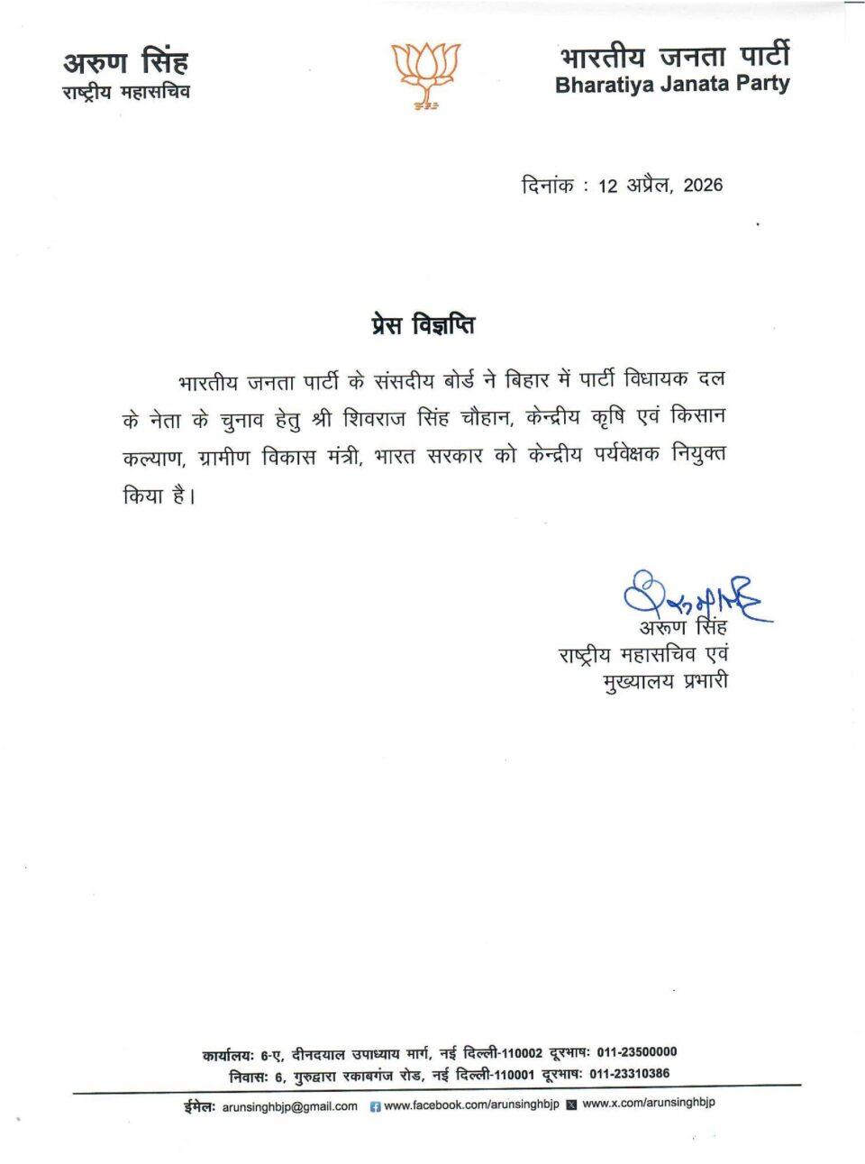 बीजेपी के संसदीय बोर्ड ने केंद्रीय मंत्री शिवराज सिंह चौहान को केंद्रीय पर्यवेक्षक किया नियुक्त है।