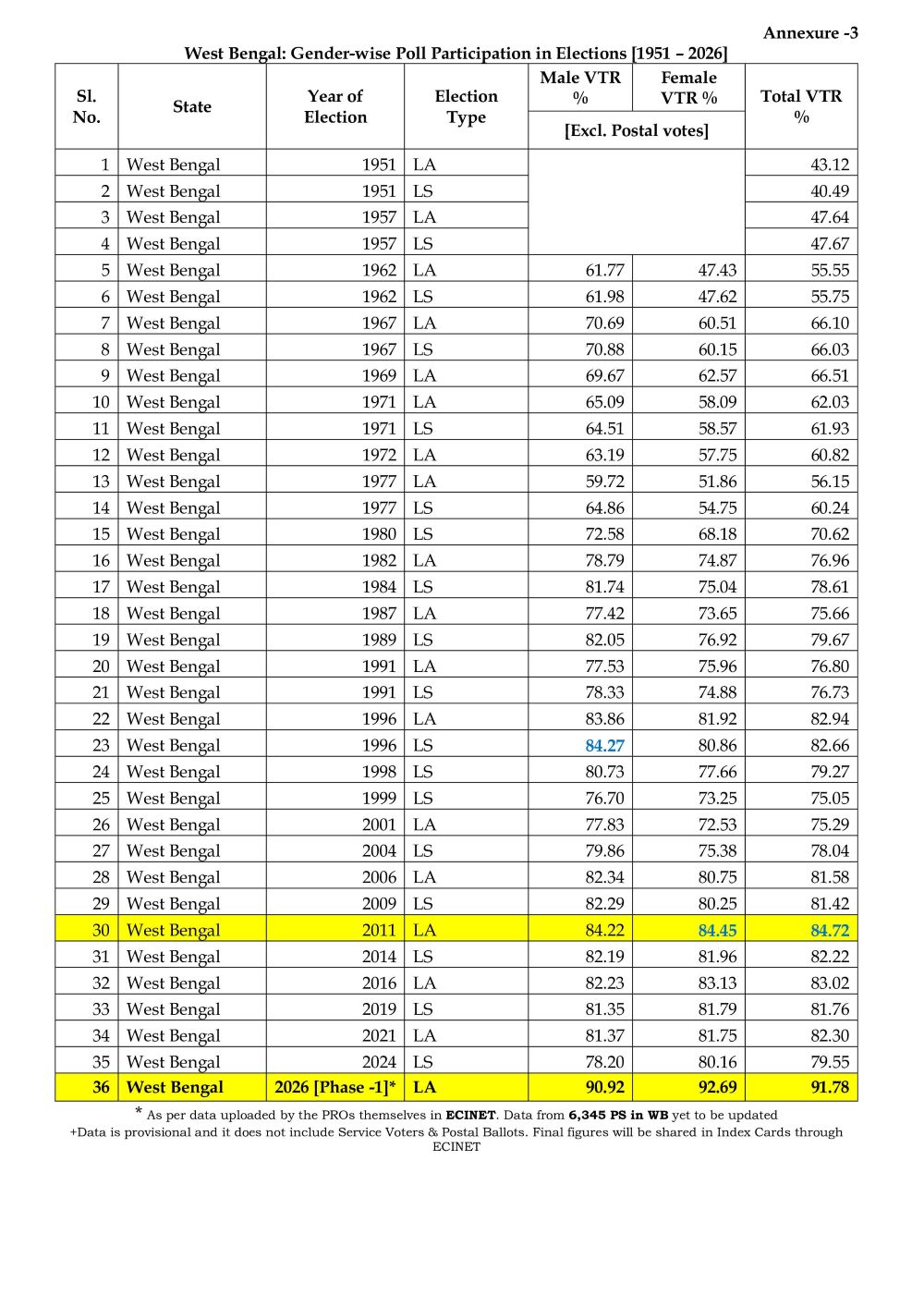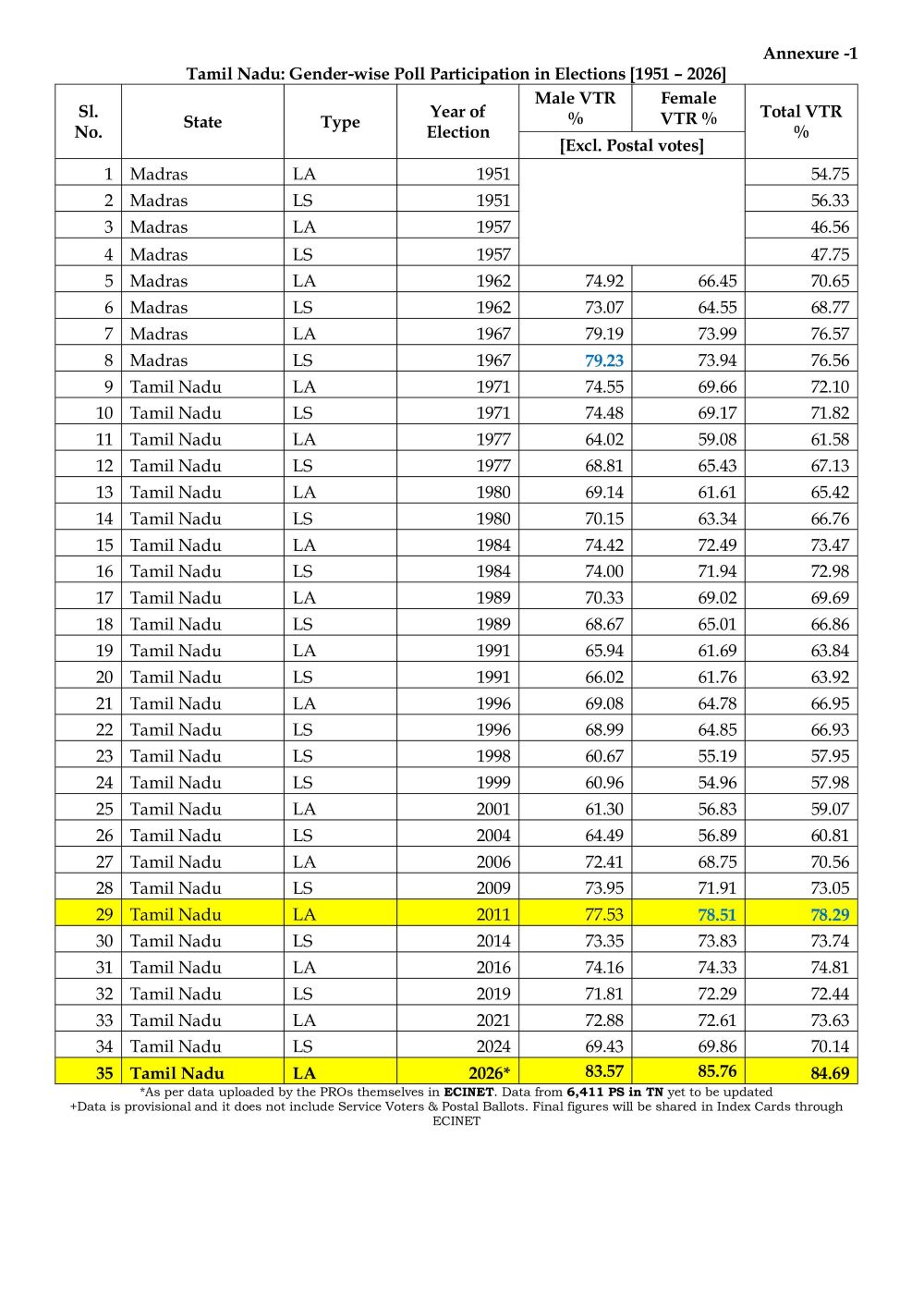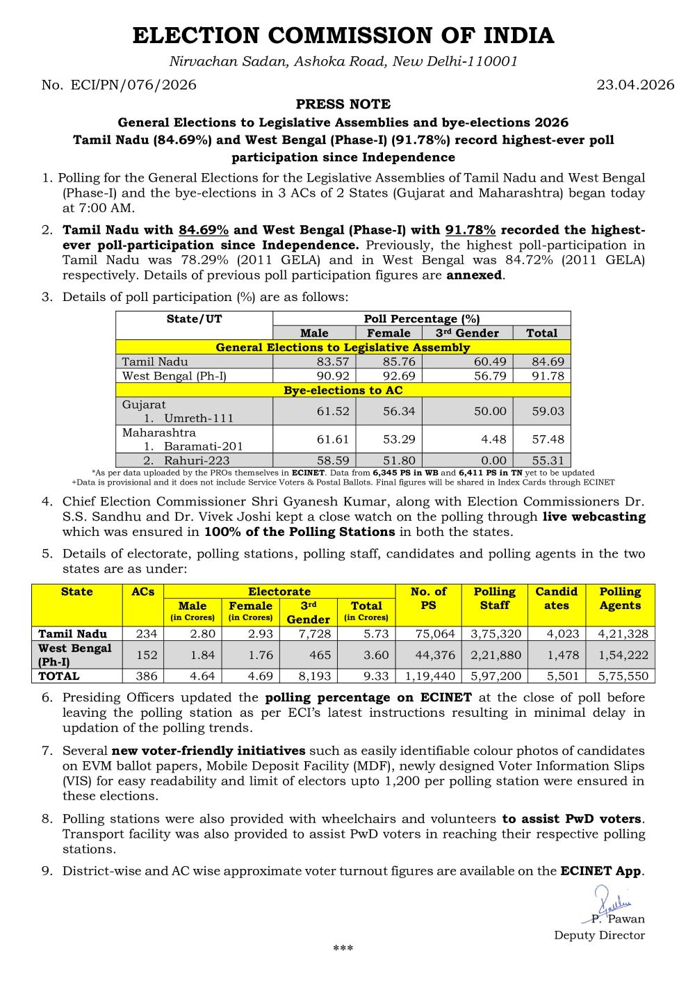 आज़ादी के बाद विधान सभा के आम चुनावों में सबसे ज्यादा वोटिंग: तमिलनाडु (84.69%) और पश्चिम बंगाल (चरण-1) (91.78%)-पढ़े।