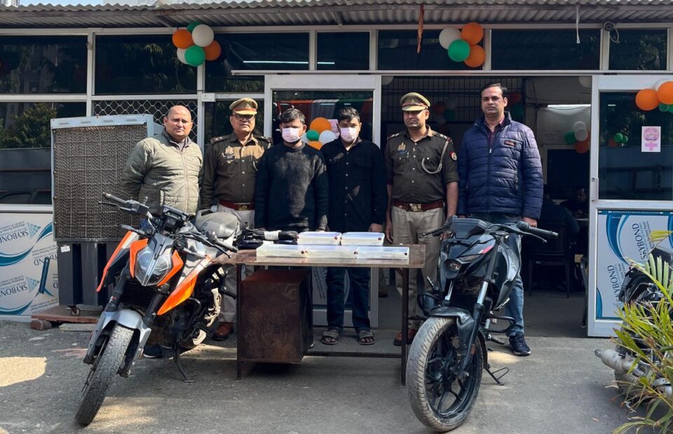 नोएडा के थाना 113 पुलिस ने स्वाट और सर्विलांस टीमों की मदद से शातिर स्नैचिंग गैंग का पर्दाफाश किया है। पुलिस दो शातिर ऐसे स्नैचर को गिरफ्तार किया है, जो केटीएम  ड्यूक और एक पल्सर लग्जरी बाइक का इस्तेमाल कर मोबाइल स्नैचिंग के लिए करते थे, जैसी पलक झपकते ही मोबाइल लूटकर फरार हो जाते थे। इनके पास से भारी मात्रा में मोबाइल और अवैध हथियार बरामद हुए हैं।पुलिस की गिरफ्त में खडे इरशाद उर्फ मिच्चू और गुलफाम को को सेक्टर-123 से गिरफ्तार किया गया है। नोएडा के डीसीपी यमुना प्रसाद ने बताया कि यह गिरोह लंबे समय से नोएडा और एनसीआर के भीड़भाड़ वाले इलाकों में सक्रिय था और अपराध को अंजाम देने के लिए लग्जरी बाइक का इस्तेमाल करता था. आरोपित  KTM ड्यूक और एक पल्सर,  लग्जरी बाइक की तेज रफ्तार का इस्तेमाल इस्तेमाल कर मॉल, मेट्रो स्टेशन और भीड़भाड़ वाले स्थानों पर मोबाइल छीनकर फरार हो जाते थे।