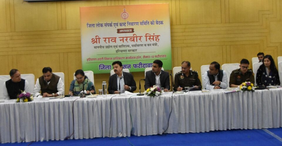 फरीदाबाद:हरियाणा शहरी विकास प्राधिकरण सम्मेलन केन्द्र, सेक्टर-12, फरीदाबाद में आज जिला लोक संपर्क एवं कष्ट निवारण समिति की बैठक का आयोजन किया गया, जिसकी अध्यक्षता हरियाणा सरकार में उद्योग एवं वाणिज्य, पर्यावरण, वन एवं वन्यजीव, विदेशी सहकारिता, सैनिक एवं अर्धसैनिक कल्याण मंत्री राव नरबीर सिंह ने की। बैठक में मंत्री के समक्ष विभिन्न विभागों से संबंधित कुल 20 परिवाद प्रस्तुत किए गए, जिनमें से 15 नए और 5 पुराने परिवादों पर सुनवाई की गई। जिसमें 18 परिवादों का समाधान मौके पर ही कर दिया गया और 2 मामलों को अगली मीटिंग तक के लिए रखा गया। बैठक में विभिन्न विभागों द्वारा रिपोर्ट प्रस्तुत की गई।