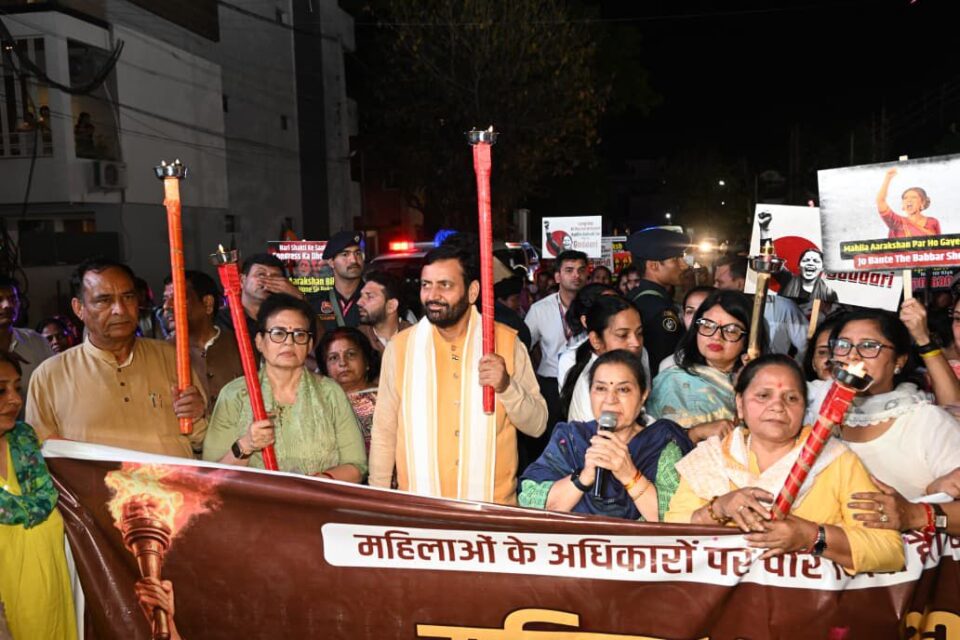 भाजपा प्रदेश अध्यक्ष मोहनलाल बड़ौली ने भी मशाल जुलूस को संबोधित किया। उन्होंने कहा कि प्रधानमंत्री नरेंद्र मोदी ने देश की महिलाओं को यह भरोसा दिलाया है कि उन्हें लोकसभा और विधानसभा में 33 प्रतिशत आरक्षण अवश्य मिलेगा। उन्होंने कहा कि यह केवल एक वादा नहीं, बल्कि एक संकल्प है जिसे हर हाल में पूरा किया जाएगा।बड़ौली ने कहा कि भाजपा सरकार द्वारा लाया गया यह विधेयक महिलाओं के सशक्तिकरण की दिशा में एक ऐतिहासिक कदम है। उन्होंने कहा कि जब तक महिलाओं को उनका पूरा अधिकार नहीं मिल जाता, तब तक यह मशाल यात्रा इसी तरह जारी रहेगी।बड़ौली ने कांग्रेस और विपक्षी दलों पर निशाना साधते हुए कहा कि ये दल केवल राजनीतिक स्वार्थ के लिए महिलाओं के मुद्दों का इस्तेमाल करते हैं, जबकि भाजपा वास्तविक रूप से महिलाओं के सशक्तिकरण के लिए काम कर रही है। बड़ौली ने महिलाओं को आश्वस्त करते हुए कहा कि प्रधानमंत्री नरेंद्र मोदी के नेतृत्व में महिलाओं को उनका अधिकार अवश्य मिलेगा।कार्यक्रम को राज्यसभा सांसद रेखा शर्मा ने भी संबोधित किया। उन्होंने कहा कि कांग्रेस हमेशा से ही महिलाओं के हक के विरोध में रही है। नारी शक्ति वंदन संशोधन अधिनियम पर कांग्रेस ने जो रवैया अपनाया है उसका खामियाजा कांग्रेस पार्टी को भुगतना होगा। रेखा शर्मा ने कहा कि चुनावों में महिला शक्ति कांग्रेस को सबक सिखाएगी। इस मौके पर  संगठनमंत्री फणीन्द्रनाथ शर्मा, प्रदेश उपाध्यक्ष बंतो कटारिया, विधायक शक्ति रानी, पूर्व मेयर उपेंद्र कौर आहलूवालिया, जिला अध्यक्ष अजय मित्तल, प्रदेश मीडिया सह प्रभारी नवीन गर्ग, संजय आहूजा, बबली शर्मा, परमजीत कौर, सोनिया सूद, रितू गोयल, सरपंच कविता, सारू ढिमरी, निश्चित शर्मा, संगीता बैंसला, अनुराधा वर्मा, मोनिका धनोया और ममता सहित बड़ी संख्या में महिलाएं मौजूद रहीं।