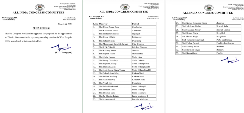 नई दिल्ली:कांग्रेस अध्यक्ष मल्लिकार्जुन खरगे ने आज शुक्रवार को पश्चिम बंगाल में आगामी विधानसभा चुनाव -2026 के लिए जिला पर्यवेक्षकों की नियुक्ति के प्रस्ताव को तत्काल प्रभाव से मंजूरी दे दी है।पार्टी द्वारा जारी किए गए लिस्ट को इस खबर में प्रमुखता से प्रकाशित की गई है जिसमें आप सभी के नाम पढ़ सकते है। यह जानकारी कांग्रेस महासचिव व सांसद के सी वेणुगोपाल ने प्रेस रिलीज के माध्यम से दी है।