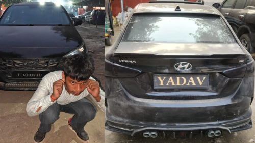 गाड़ी की नंबर प्लेट से नंबर हटा कर नम्बर की जगह आगे BLACKLISTED तथा पीछे YADAV लिखवाया हुए था-छात्र पकड़ा गया।