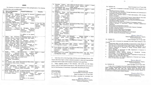 वे हरियाणा मिनरल्स लिमिटेड, नई दिल्ली के प्रबंध निदेशक भी रहेंगे।सचिन गुप्ता, जो वर्तमान में सिंचाई एवं जल संसाधन विभाग के अतिरिक्त सचिव तथा एचएसएमआईटीसी के प्रबंध निदेशक तथा रोहतक के उपायुक्त हैं,  को हरियाणा शहरी विकास प्राधिकरण, रोहतक के प्रशासक तथा शहरी सम्पदा, रोहतक अतिरिक्त निदेशक का कार्यभार भी सौंपा गया है।एचसीएस अधिकारियों में अमित कुमार-1 को उपमंडल अधिकारी (नागरिक), पुन्हाना लगाया गया है। वीरेंद्र चौधरी को श्री शम्भू के स्थान पर जिला परिषद कुरुक्षेत्र तथा डीआरडीए कुरुक्षेत्र का मुख्य कार्यकारी अधिकारी नियुक्त किया गया है।मनीष कुमार लोहान, जो वर्तमान में नागरिक उड्डयन विभाग के अतिरिक्त निदेशक के पद पर कार्यरत हैं, को खान एवं भूविज्ञान विभाग तथा सूचना, जनसम्पर्क एवं भाषा विभाग के अतिरिक्त निदेशक का कार्यभार भी सौंपा गया है।सुरेंद्र सिंह-2 को मेडिकल कॉलेज खानपुर कलां, सोनीपत में अतिरिक्त निदेशक (प्रशासन) नियुक्त किया गया है।वेद प्रकाश को उपमंडल अधिकारी (नागरिक) डबवाली; भूपेंद्र सिंह को उपमंडल अधिकारी (नागरिक), पलवल तथा अश्वीर सिंह को उपमंडल अधिकारी (नागरिक) बरवाला लगाया गया है।संजीव कुमार को मनोज कुमार-1 के स्थान पर उपमंडल अधिकारी (नागरिक) बावल नियुक्त किया गया है।इसी प्रकार, एचसीएस अधिकारी सुश्री अनमोल को सहकारी चीनी मिल, सोनीपत का प्रबंध निदेशक लगाया गया है।सुश्री ज्योति नागपाल को सिटी मजिस्ट्रेट गुरुग्राम; सुश्री सपना यादव को संयुक्त निदेशक (प्रशासन), हिपा गुरुग्राम; हनी बंसल को उपमंडल अधिकारी (नागरिक) फरीदाबाद तथा अंकित कुमार-2 को उपमंडल अधिकारी (नागरिक) गोहाना नियुक्त किया गया है।एचसीएस अधिकारी  शंभू तथा मनोज कुमार-1 के नियुक्ति आदेश बाद में जारी किए जाएंगे। दोनों अधिकारी कार्यमुक्त होने के बाद मुख्य सचिव कार्यालय में अपनी ज्वाइनिंग रिपोर्ट प्रस्तुत करेंगे।अजीत सिन्हा की रिपोर्ट हरियाणा ने तत्काल प्रभाव से एक आईएएस और 2 एचसीएस अधिकारियों के स्थानांतरण एवं नियुक्ति आदेश जारी किए हैं।आईएएस अधिकारी डॉ. सुभिता ढाका को रजिस्ट्रार, सहकारी समितियां नियुक्त किया गया है।वहीं, एचसीएस अधिकारी सुश्री चिनार को स्कूल शिक्षा विभाग में उप सचिव नियुक्त किया गया है।हरि राम को अप्रतिम सिंह के स्थान पर उपमंडल अधिकारी (नागरिक), हथीन नियुक्त किया गया है।अप्रतिम सिंह के नियुक्ति के आदेश बाद में जारी किए जाएंगे। वे अपना कार्यभार छोड़ने के बाद मुख्य सचिव कार्यालय में अपनी ज्वाइनिंग रिपोर्ट प्रस्तुत करेंगे।