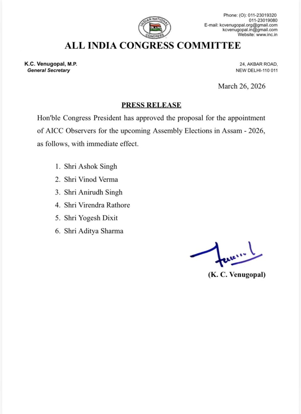 नई दिल्ली:कांग्रेस अध्यक्ष मल्लिकार्जुन खरगे ने आज गुरुवार को असम में आगामी विधानसभा चुनाव-2026 के लिए एआईसीसी पर्यवेक्षकों की नियुक्ति के प्रस्ताव को तुरंत प्रभाव से मंजूरी दे दी है। जैसा कि निम्नानुसार है, पार्टी द्वारा जारी की गई लिस्ट को इस खबर में प्रमुखता से प्रकाशित की गई है, को पढ़े।