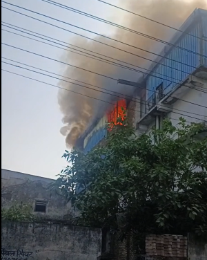 आग की लपटों से घिरी वायर रोप इंडिया के ऊपरी फ्लोर पर आग लगी है,  जिसे फायर ब्रिगेड की टीमे बुझाने में जुटी हैं,  सेक्टर 6 के E 69/70 स्थित यह फैक्ट्री भारी सामान उठाने के लिए इस्तेमाल होने वाली लोहे की रस्सियां (Wire Ropes) बनाती है। आज सुबह इसमें अचानक आग लग गई और देखते ही देखते धुएं का गुब्बार आसमान में छा गया। चीफ फायर ऑफिसर (CFO) प्रदीप कुमार ने बताया कि फिलहाल हमारी प्राथमिकता आग को चारों तरफ फैलने से रोकने की है,  ताकि नुकसान कम से कम हो। राहत की बात यह है कि फैक्ट्री के अंदर कोई भी व्यक्ति फंसा हुआ नहीं है और न ही किसी जनहानि सूचना है।”चीफ फायर ऑफिसर ने बताया कि आग लगने के कारणों और इससे हुए आर्थिक नुकसान का सटीक आकलन जांच के बाद ही हो पाएगा। फिलहाल दमकलकर्मी लपटों पर काबू पाने का प्रयास कर रहे हैं।