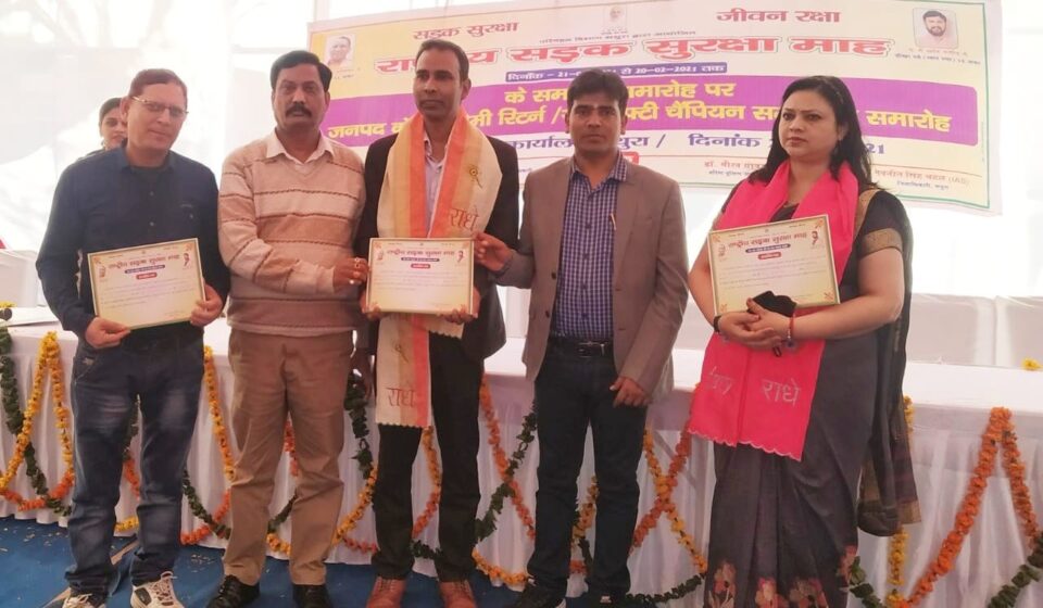 मथुरा: राष्ट्रीय सड़क सुरक्षा महा के समापन पर मथुरा उप संभागीय परिवहन कार्यालय मथुरा के प्रांगण में आयोजित किया गया कार्यक्रम। इस कार्यक्रम के माध्यम से मथुरा जनपद में भारत सरकार के द्वारा गुड सेमी रिटर्न के रूप में यातायात के क्षेत्र के साथ सड़क दुर्घटना में घायल व्यक्तियों को रक्त उपलब्ध करवाने के साथ लोगों की जान बचाने के लिए मथुरा में काम करने वाली उत्तर प्रदेश की एकमात्र सामाजिक संस्था बृज यातायात एवं पर्यावरण